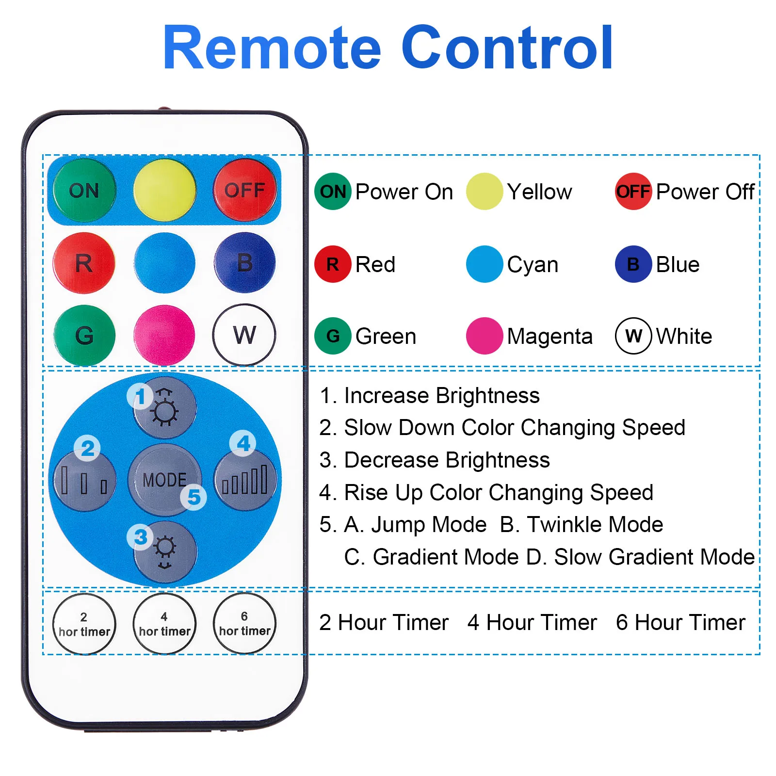 【Timing & Energy Saving】: There are timing options on the remote control (2H, 4H, 6H), Set the lights to stay on for 2, 4, or 6 hours, it means you can turn lights on at dusk, turn off at dawn automatically.